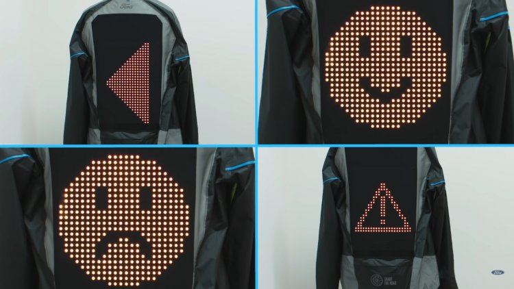 Компания Ford разработала специальную куртку для велосипедистов Emoji Jacket, которая с помощью LED-индикаторов на спине демонстрирует другим участникам движения эмодзи и важные знаки.