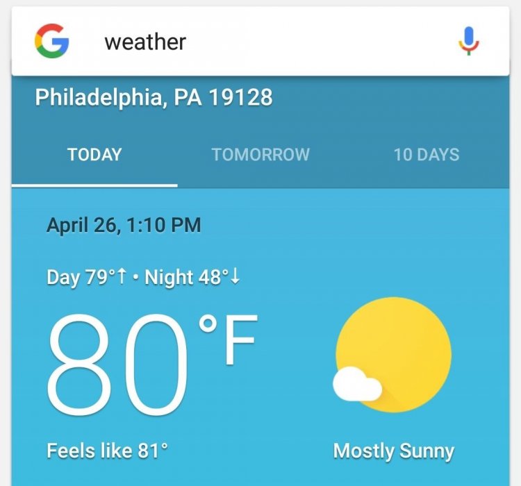 Раніше існувало піддодаток всередині Google App, в якому можна було переглянути детальну інформацію про погоду і час заходів і світанків на сьогодні, завтра і 10 днів вперед. Схожа картка зараз відображається всередині пошуку, але вкладки «Завтра» і «10 днів» не працюють, а даних про поточний метеорологічний стан не так багато.